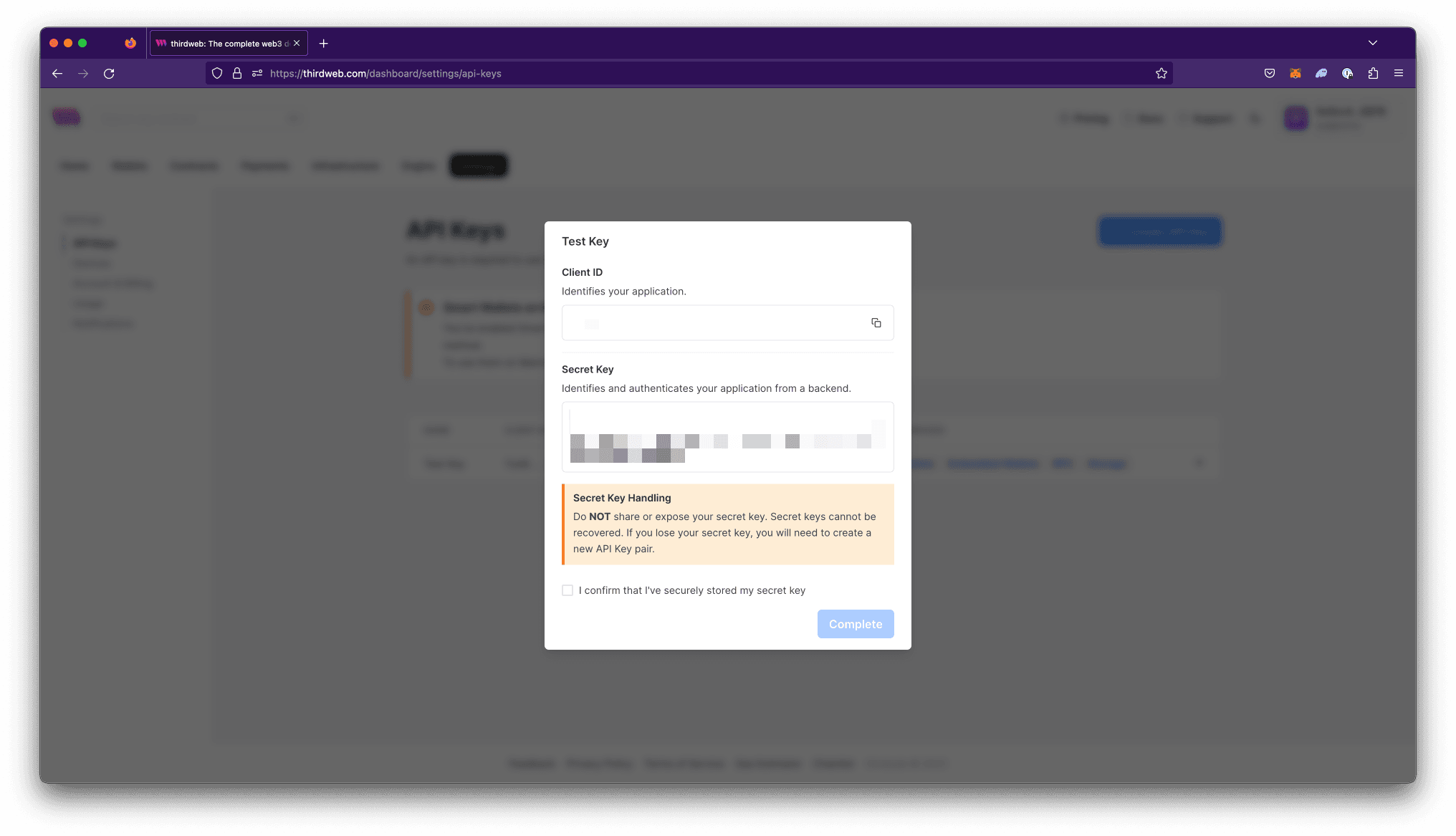 Store your secret key in a secure location and confirm that you have stored it by checking the checkbox then select Complete.