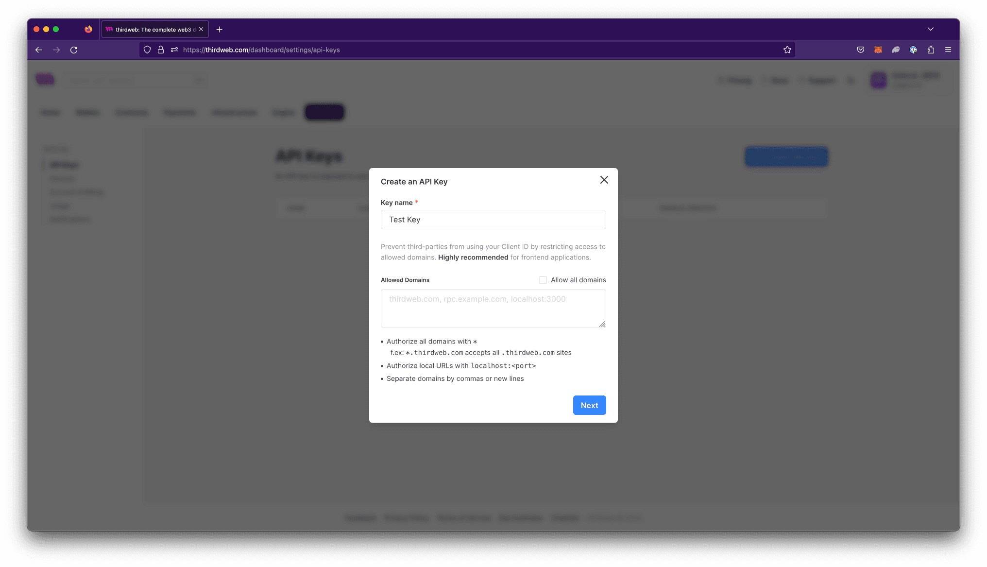 Input the domains you want to restrict your application to in Allowed Domains then select Next. Restricting domains is highly recommended for any applications with client-side code or frontend applications.