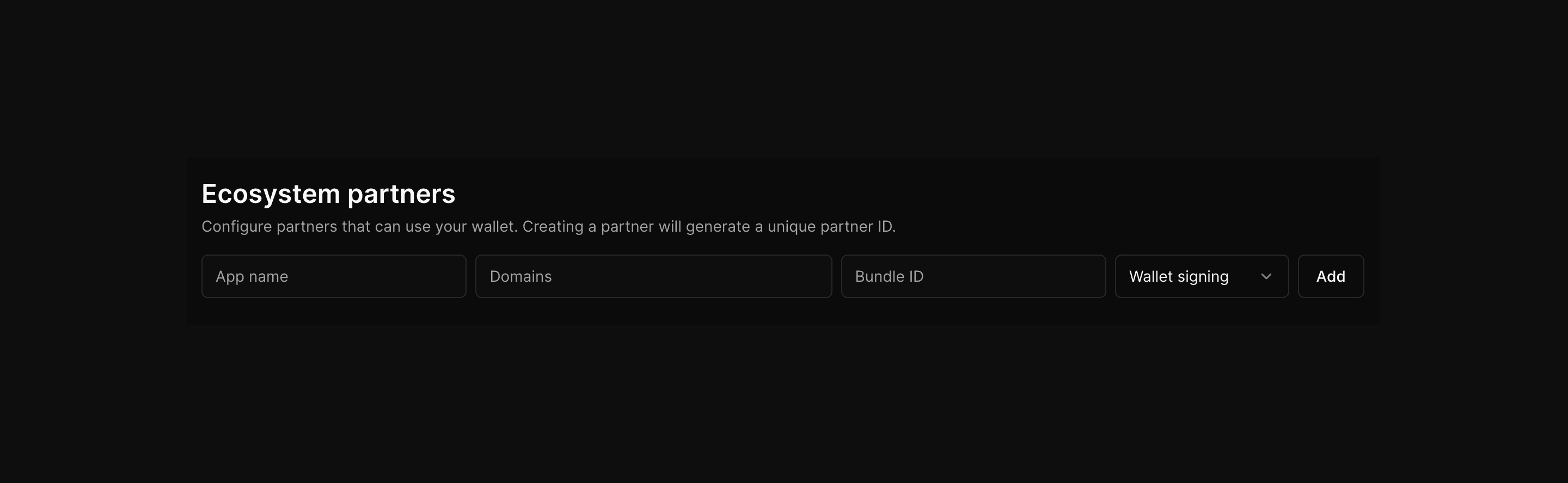 For each application on your allowlist, you'll need to specify a name, a list of allowed domains, and an optional bundle ID (for mobile applications). The list of domains will determine where a partner will be able to display your ecosystem as a login option. Once a partner is added, a Partner ID will be generated.