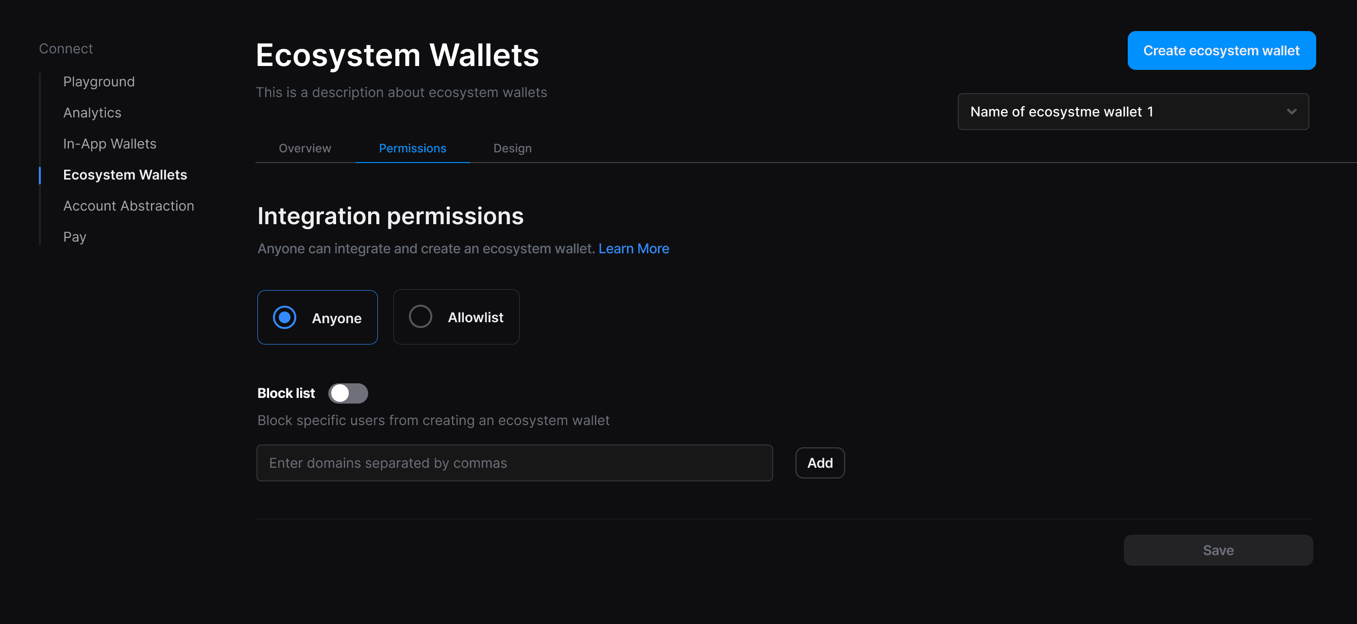 If you’re looking to create an ecosystem wallet for select partners, you can head to the Ecosystem Wallet dashboard, navigate to Permissions, and select “Allowlist”.
