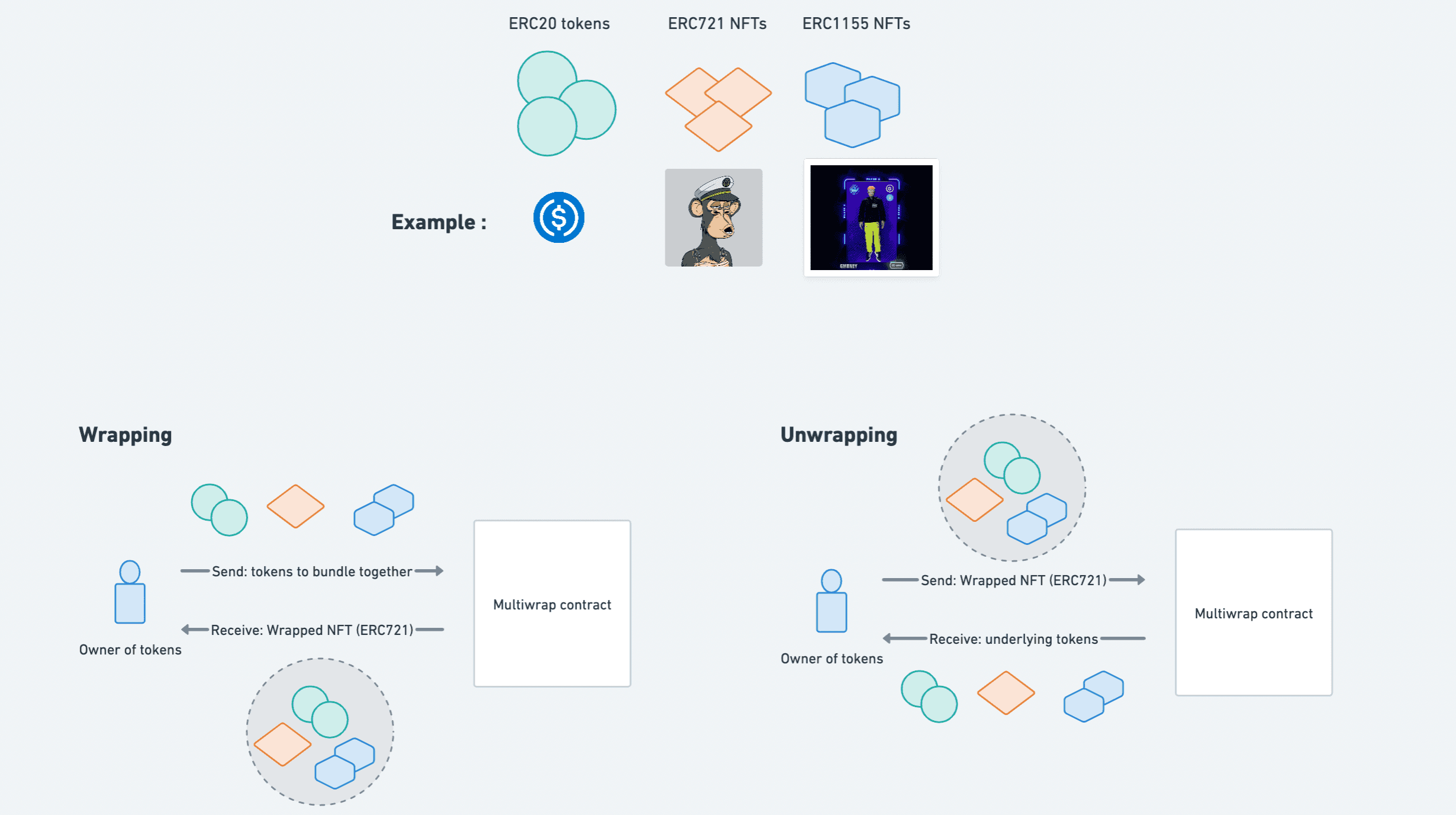 It lets you wrap arbitrary ERC20, ERC721 or ERC1155 tokens you own into a single wrapped token / NFT. This means escrowing the relevant ERC20, ERC721 and ERC1155 tokens into the Multiwrap
