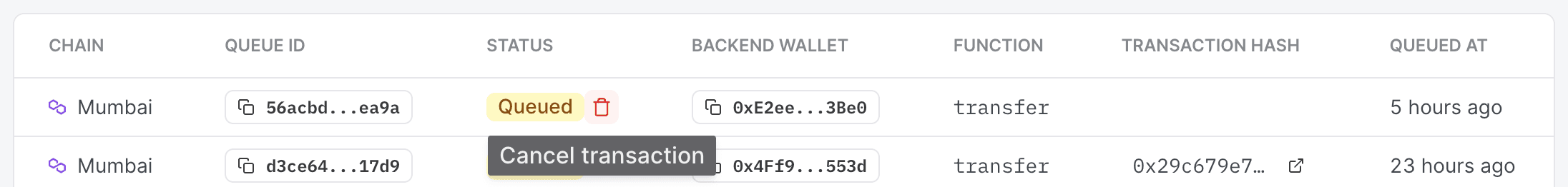 - If the transaction is not yet submitted, this endpoint will remove it from the queue.